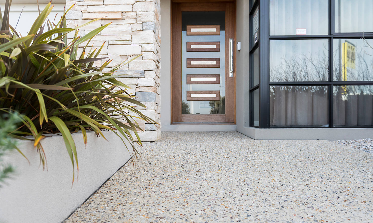 Exposed aggregate concrete combines strength with natural beauty. Its textured finish is perfect for driveways, pathways, and outdoor entertaining areas.