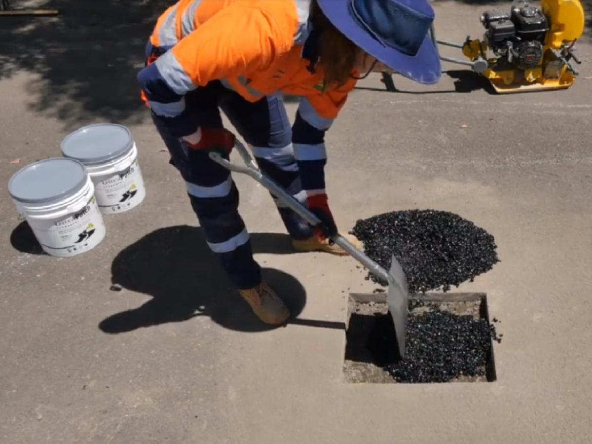Pour the material directly from the bag or bulk container into the repair area. For deep holes, apply in layers of 25–50 mm.